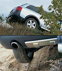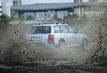 + Vysvetlenie vozidla v hornej časti vzduchového zavesenia, ako sme už písali, je vyššia ako v prípade spolužiakov - Volvo, Subaru a BMW. Je rovnaký ako Jeep Grand Cherokee. To znamená, že všetok pohon, primerane vybraný tlak a pneumatiky Pirelli P6 otvárajú cestu pred autom, o ktorom iné autá nesnívali. Niekoľkokrát, bez akýchkoľvek problémov, sme išli na piesočnatej dráhe Audi, kde jednoducho nie je nič robiť monotívny stroj.