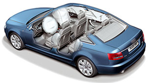 Hållbar stålkropp med krossade zoner Grunden för hög passiv säkerhet A6. Frontal, framsidan (i säten) kuddar och uppblåsbara gardiner är installerade i standardkonfiguration