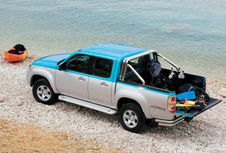 Ursprungligen var BT-50 tänkt som den första zoomzoomupphämtningen, som inte skiljer sig från komfortnivån från passagerarsamlingar. Det var detta tillvägagångssätt som gav ett bra genomförande i Ryssland, eftersom potatis eller ved sällan bär på dessa lastbilar. Allhjulsdrivna bil finns ofta i stora städer, inklusive i Moskva. Dessutom blir en mängd olika vattencyklar, fyrhjulingar, skotrar, snöskotrar och andra tekniker som måste transporteras på något alltmer populära. MAZDA BT-50 i sådana fall är en oumbärlig assistent. Om något inte passar i kroppen kan du använda släpvagnen. Pickup kan dra en vagn som väger i 3 ton. Sant måste förutsättningen för släpvagnen vara sina egna bromsar. Med sin frånvaro är det möjligt att bara dra 750 kg. Minns, nu är bilen släppt i tre versioner av vanlig hytt (2 platser, lång lastkropp), freestyle cab (4 platser öppnade i mitten av dörren) och dubbelhytt (2 framsäten, 3-bädds baksäten på sofftyp). Endast den mest bekväma och dyra dubbla stugan är officiellt till vårt land. Av de särskiljande egenskaperna är det värt att notera en pickup stötfångare, praktiskt taget oförmögen att gå utöver kropparna, som på de flesta lastbilar.