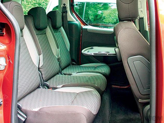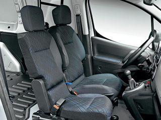 För första gången i klassrummet för lätta skåpbilar på en last, föreslog en Peugeot-partner en tre-sitsarförarens stuga. Multiflex-systemet (Multi-Flex) är ett brett höger säte uppdelad i två ojämna delar. Vid vikning ökar den högra maximala lastlängden med 1200 mm, och fackfacket är 400 liter. Växellådspaken är belägen på utskjutningen av mittkonsolen och är inte förvirrad i mitten av mittpassageraren. Men för att vara ärlig, i mitten är det bättre att plantera en liliput: tre medelstora män kommer att tåla en tio femton minuter här mycket nära.