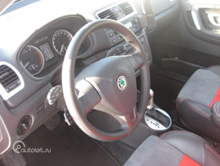 Dörrarna till Skoda Fabia Sport öppna och nära med ett läckert ljud, som du vanligtvis möter i premiumbilar. Svart salong avger fängslande säten av läder och Alcantara. Till beröring och titt gör de korrekt. Två lutningar på rygg och höjd. Jag gillade att sitta, särskilt när du flyger till en skarp sväng. Rattet är tillräckligt stort och läder för alla, även som har en tårta. Justering är en i lutning. Takens höjd i Skoda Fabia Sport är utmärkt: Jag sitter med mina dimensioner på 189 centimeter utan problem. Startaren är densamma och nyckeln är nästan densamma som på Volkswagen. Platsen för omkopplarna på ratten är också liknande. Instrumentskölden i Skoda rörde mig alltid, särskilt pilarna på varvometern och hastighetsmätaren när de hoppar, det är en känsla av att de lever. Men teckensnittet för siffror väljs, även om det är trendigt, men inte praktiskt. Kegl är liten, vad du än säger. Och de säger och skriver mycket tack om detta.