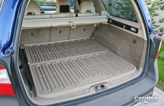 Stammen Volvo XC70 är en separat historia. Så mycket som 575 liter med en upphöjd soffa! Bakdörren är utrustad med en elektrisk enhet. I stammens golv, flera ytterligare fack lurade, är golvskyddet utrustat med en stötdämpare och håller den i upphöjd läge. De bakre sätena läggs ut i en del av 20/40/20 och bildar ett jämnt golv, medan det gynnsamma utrymmet ökar till 1600 liter.