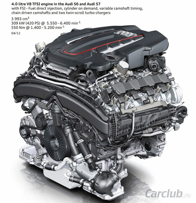 Sekiz silindirli motorun 4.0 litre hacmine sahip bir hacimğinin gücü Audi S8'ten 420 HP'ye düşürülür. Motor, çift turboşarj, doğrudan yakıt enjeksiyonu ve silindirlerin yarısı ile donatılmıştır. Test sırasında, rota bilgisayarı, 10 litre seviyesinde ortalama yakıt tüketimini gösterdi.