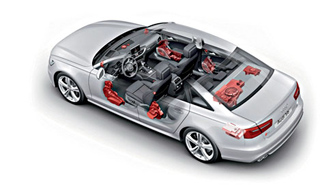 Audi S6. Kilo azaltma dikkatini arttırdı. Tüm harici monte paneller alüminyumdan yapılmıştır, ancak kanatlı metalden yapılmış birçok parça genellikle ortalama bir erkeğin gözünden gizlenir. Sonuç olarak, S7% 20'de alüminyum parçaların toplam yüzdesi! Vücudun yapısı, yüksek mukavemetli çeliklerin bir yüzdesidir. Bunlardan, tüm unsurlar, artan bir yük olduğu için gerçekleştirilir. S7'deki sürgülü spoyler, ağırlık tasarrufu için de plastikten yapılmıştır.