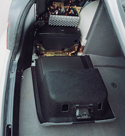 oluk, solda bir ip çantası asabileceğiniz bir kanca var. BMW Properrieties birçok aksesuar sunar: ek kancalar, ağlar, kutular, ancak en çok gerekli olan bir lastik halıdır (82 $), böylece sadece bir gövde halı işaretini öğütmek için. - CD kutularını saklamak için bir şey bulabilir. Chainer, bagaj bölmesinin sol tarafındaki astarın arkasında.