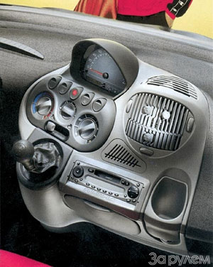 Sırtlar orta, katlanmış bir durumda, geniş kolçaklar oluştururlar. Ailenizde (veya şirkette) sadece beş tane varsa, sandalye yerine büyük bir boks kutusu kurulabilir. Böyle bir genişlik, makinenin geniş bir genişliğinden kaynaklanmaktadır - örneğin Volga'da 70 mm daha fazla. Uzunluk dört metreden az, sekizden daha kısa! Aynı zamanda, ayağınızı ayağınıza atarak arkada oturabilirsin. Ön panelin ortasında, bir karınca yuvasına benzeyen uzaktan bir şey var. Evet, oradan bir tür yüz yapışıyor! Ya robot ya da şövalye duvarlı. Aslında, bu cihazların, havalandırma kontrol panelinin ve bir radyonun bir kombinasyonudur ve yüz bir deflektör bloğudur. Garip görünüme rağmen, tüm bu yapı çok işlevseldir.