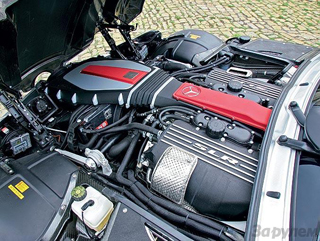 Frenler: 8- ve 4 silindirli kaliperler pedleri seramik havalandırılmış disklere bastırır (önde 370 mm çap ve 360 \u200b\u200bmm geride). Bildirilen hizmet ömrü 300.000 km! Buna ek olarak, yoğun yavaşlama ile balon kıçta öne sürülür. Motor: 8 silindirli, kuru bir krank kılıfı ve ünlü atalar gibi mekanik bir süper şarj cihazı. Aslında, bu 460 kW/626 hp veren çapraz bir motor SL 55 AMG'dir. ve 780 nm.