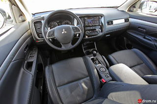 Önceki Outlander XL, ön cephesi de yapay ciltle kaplı olan basit bir salon için defalarca eleştirildi. İç mekan, elbette alıcıların sevmediği minimalizmin yüksekliğiydi. Rakipler bu açıdan XL'de dolaştılar. Japonlar daha iyisini yapmaya çalıştı. Ön panelin üst kısmı, bir raftan diğerine uzanan hoş elastik plastik ile tamamlanmıştır. Merkezi konsol burada değil, ancak sürücüye odaklanan ve siyah vernik altında plastikten yapılmış bir astarla birleştirilen bir tür kokpit var.