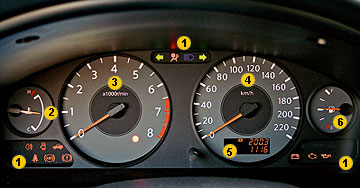 1. Kontrol piktogramları. 2. Soğutucu sıcaklık işaretçisi. 3. Takometre. 4. Hız göstergesi. 5. Kilometre sayacı ve günlük kilometre sayacı. 6. ACP modu göstergesi. 7. Yakıt Seviyesi Endeksi.