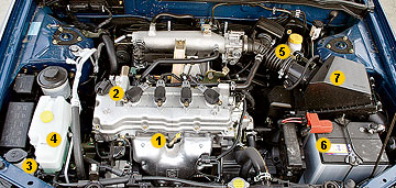1. Yağ çubuğu. 2. Motorun yağ arıtma boynunun kapağı. 3. Çiçek tankı tankı mücadelesi. 4. Soğutma sistemi genişletme tankı. 5. Ana fren silindirinin tank. 6. Şarj edilebilir pil. 7. Hava filtresi gövdesi.