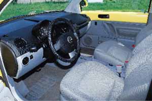 Arabaya yandan bakarsanız, bu durumda tasarımcının ana (veya tek) enstrümanının hem çatı hem de kanatların çizildiği pusula olduğunu anlarsınız. Eksik ön tamponun yerinde, hava alımının boşluğu açıkça görülebilir, ön hat düzeni hakkında konuşur ve araba çimlerin üzerindeki ön tekerleklerle kayarken, nihayet hiçbir şeyin ilgili olmadığını anlarsınız. eski böcek. Yeni böcek VW Golf IV platformuna dayanıyor. Doğal olarak, motor ilerledi ve ön tekerlekler ön tekerlekler oldu. Bitmiş platformun kullanımı, üretim maliyetini azaltmayı mümkün kıldı, ancak eski bedenin boyutlarında hiçbir şey için boşuna değildi.