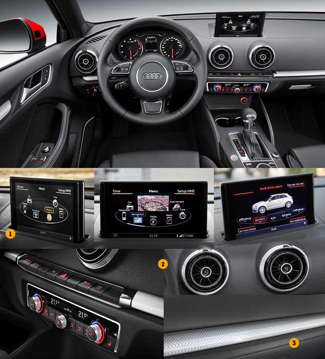 У салоні нового A3, дуже мало кнопок більшість функцій можна керувати або через бортовий комп'ютер, використовуючи ключі на рульовому колесі, або використовуючи джойстик MMI з сенсорною панеллю та парою стильних рокерських вимикачів.
