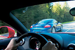 мільйон років тому. У ньому ви відчуваєте, як голодні рептилії юрського періоду - інші автомобілі здаються жалюгідними, ледь утворені ссавці. Вони повільно, незграбно і безглуздо: перший повернутися в смердить, а потім замкнули один одного, починають сіпатися в пошуках вільної частини дороги. Так, жорсткі педалі і пружні проблеми важеля коробки на першому дратують. І посадка дуже низька водія вимагає звикання. Але ці ергономічні нюанси скоро починають радувати. Тут реалізується принцип не думати, але діяти. Швидкість вибору швидкості працює насправді добре - це неможливо пропустити необхідну передачу, ви відчуєте себе вільними нейтральними при маніпулюванні, і перемикання легко виконується навіть з половиною розміру муфти. Рульове управління дає відчуття тваринного руху. У жирним шрифтом керуються не шостим почуттям, але цілком відчутною на рульовому колесі з передніми лапами з дорожньої гармати. Cayman S з дивовижною чіткістю реагує на різку зміну швидкості. Швидке відновлення з ряду в ряд, інакше як відскік в сторону, ви не можете зателефонувати.