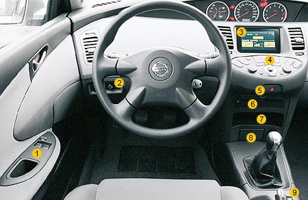 1. Блокувати вікна. 2. Коректор фари та дистанційне управління налаштуванням дзеркала. 3. Монітор інформаційної камери дисплея/заднього перегляду. 4. Блок управління аудіосистеми, управління кліматом та бортовий комп'ютер. 5. Перемикач тривоги. 6. CD -програвач. 7. Ніша для тонкого багажу. 8. Апельська та сигаретна запальничка. 9. Внутрішня кнопка блокування центрального замка.