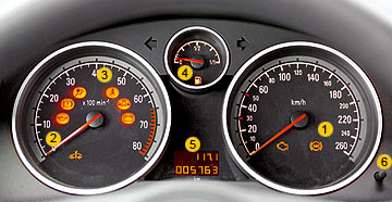 1. Спідометр. 2. Тахометр. 3. Сигнальні світильники. 4. Індикатор рівня палива. 5. Лічильник пробігу. 6. Кнопка для нуля щоденного запуску.