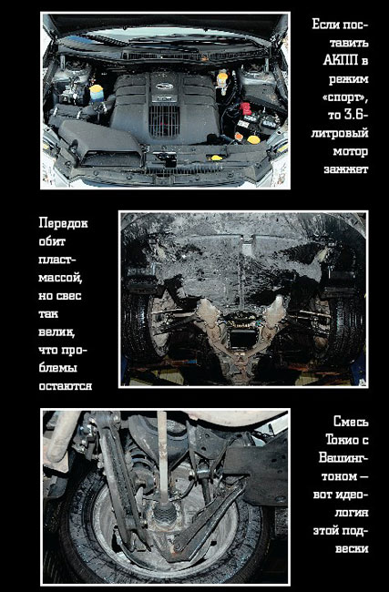Таким чином, ми не будемо розпускати соплі, відволікаючись на дрібниці, і відразу ж вони негайно заморозити всі 258 коней. Двигун H6 3,6 л є найбільш об'ємним в гамма Subarovsk. Але це не єдина перевага. Він також характеризується низьким рівнем вібрації і відмінною балансування. Це майже не чути на низьких оборотах. Але навіть при такому бурхливому двигуні, краще їздити в спортивному режимі автоматичної коробки передач, так як звичайний алгоритм роботи машини теж порушення. Чому б не зробити спортивний Basic, такими як, наприклад, в Honda CR-V, де машина без наконечника дозволяє включити двигун до 6500 обертів на хвилину? Правда, Subaru рекламодавці писали про свої автоматичних трансмісіях, що це передача, яка забезпечує виконання будь-якого вашого бажання. Не вір. Я думаю, багато, так що нічого не вийшло.