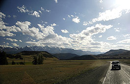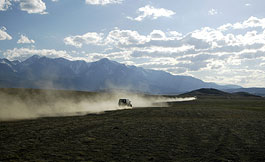 Ще однією перешкодою на нашому шляху була неякісним бензином. Сурогатний патріот зберігається або на першій заправці на заводі або на місцевих автозаправних станціях. Симптоми однакові - автомобіль перестає тягнути на лінії, повільно прискорюється, а потім починає рухатися взагалі з шпижком. Причиною заготовленого сітчастого фільтра підводного паливного насоса. Як правило, він забивається не великими частинками, але смолисті домішки зважуються в бензині. Біла сітка стає жовтувато-коричневим. Щоб усунути проблему, фільтр може бути виготовлений за його компресором, але краще мати запасний. До речі, є подібні проблеми з моделями передніх приводів ВАЗ. Частина шляху, що відокремлює нас від гір. Сніжні вершини Алтайських гір, на горизонті. Ми подолали пару маленьких братів і опинилися на дорозі, яка йде прямо вздовж Кураї степу. Поверхня степу практично позбавлена \u200b\u200bрослинності, тоді як вона знаходиться в низинах і оточена горами.